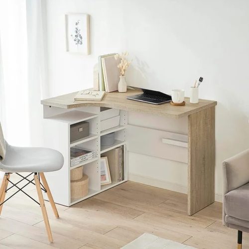 優れた収納性も備えるL字型パソコンデスクです。天板のサイズは幅110×奥行45〜60cmで、素材にはキズや汚れに強いPVC天板を使用。天然木のような凹凸のある質感や、ヴィンテージ調の美しい仕上がりも手軽に楽しめます。