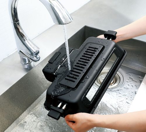 サイズは約幅450×奥行210×高さ180mmとコンパクト。キッチンにスッキリ収納できます。ふた・焼き網・水受け皿は分解して水洗いできるので、お手入れは簡単。少人数家族でグリル料理を手軽に楽しみたい方におすすめです。