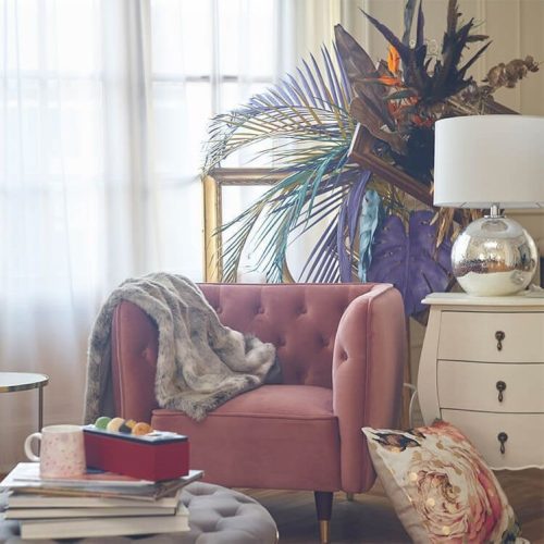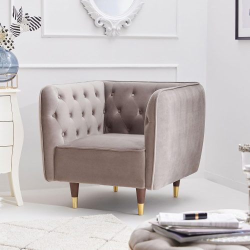 アンティークな雰囲気を醸し出す1人掛けソファです。エレガントなデザインで、大人かわいい部屋を作りたい方にぴったり。木目とゴールドの脚やハンドメイドのボタンなど、細かい部分までこだわって作られています。