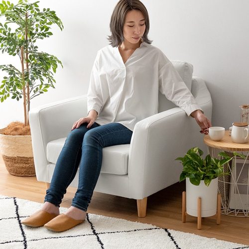 脚付きタイプの安い1人掛けソファです。脚の高さが約20cmあり、立ち座りしやすいのが特徴。座面下に空間が生まれるので、掃除はスムーズに行えます。耐荷重が約80kgある丈夫な設計で、長く使いやすいのもポイントです。