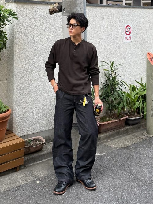 ブラウンのヘンリーネックシャツに、ダークインディゴのワイドデニムを合わせたアメカジコーデです。トップスは落ち着いた色合いで大人な雰囲気を演出。ボリュームのあるボトムスがAラインのシルエットを形成しています。