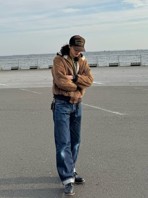 ジャケットとキャップの色をブラウン系で統一し、まとまりのあるスタイルに。デニムの裾をロールアップして黒のレザーシューズを見せることで、足元からこなれ感を演出します。武骨さのなかに洗練された雰囲気が感じられるコーディネートです。
