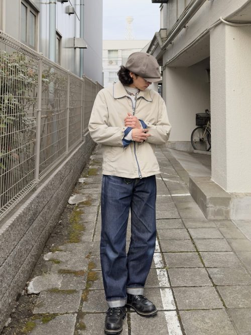 ベージュのジャケットに濃い色のワイドデニムを合わせた、きれいめカジュアルコーデです。ジャケットの襟とジッパー部分のブルーが爽やかなアクセントに。ボトムスにはゆったりとしたシルエットのデニムを選び、リラックス感を演出しています。