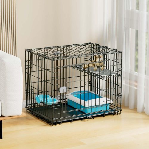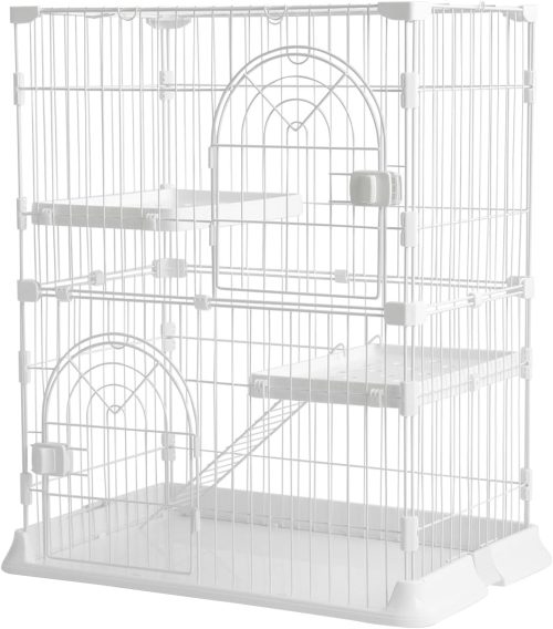 空間の効率的な分割設計が特徴的な猫用ケージ。上段は見晴らしのよい遊び場として、下段はトイレや隠れ家スペースとして機能します。