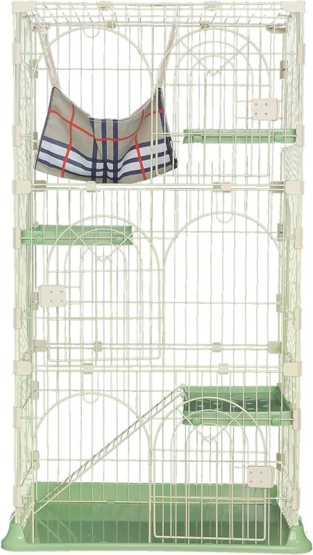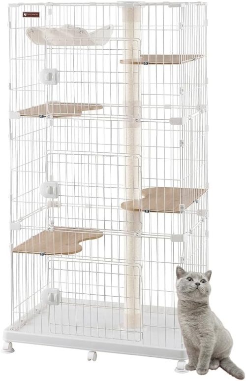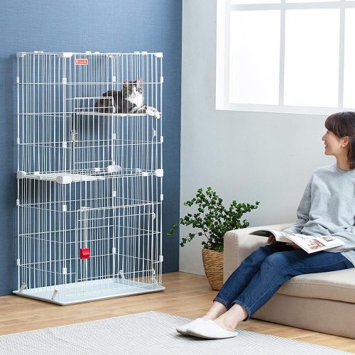 ロック機能付きで脱走を防止し、3cm間隔の柵により子猫の安全も確保。棚板の高さは猫の成長に合わせて自由に調節でき、イラスト付きの日本語説明書で組み立ても簡単に行えます。