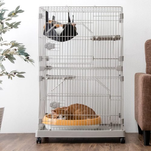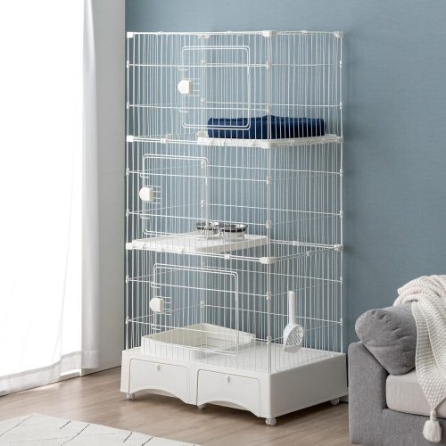 多頭飼いに配慮した3段構造の大型猫用ケージ。キャスター付きで移動や掃除が楽に行え、猫の様子に合わせて設置場所を変えられます。