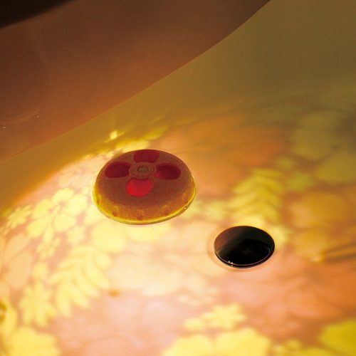 浴槽にカラフルな模様が投影されるバスライト。幻想的で楽しい雰囲気を演出します。Bluetooth接続により、スマホなどから音楽を再生したり、内蔵マイクを使ってハンズフリー通話をしたりできるのも特徴。便利に活用できます。