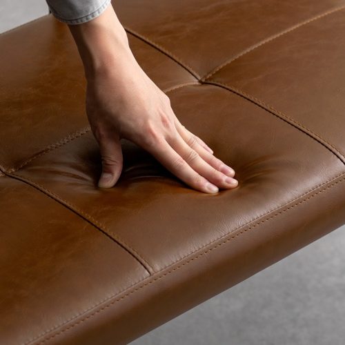 表面には本革のようなシボを再現したPUレザーを採用。キルティング加工が施された座面と、背もたれに細いブラックスチール製の脚を組み合わせたヴィンテージライクなデザインも魅力です。