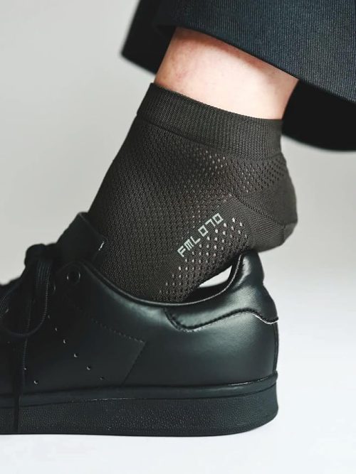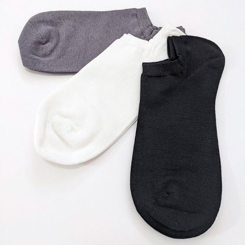 シルク75%、ポリウレタン25%の混紡生地を使ったミニマルなデザインのスニーカーソックスです。生地は夏でも冬でも使いやすい、ほどよい厚み。カラーは、ブラック・グレー・ホワイトとベーシックなモノをラインナップしています。