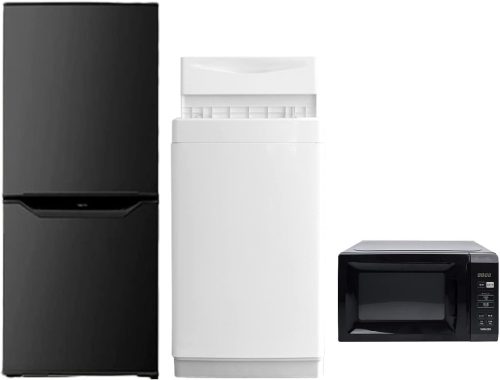 一人暮らしに必要最低限の基本家電を揃えたセット。6kgの全自動洗濯機と106Lの2ドア冷蔵庫、17Lの電子レンジの3点が含まれており、新生活をすぐにスタートできます。