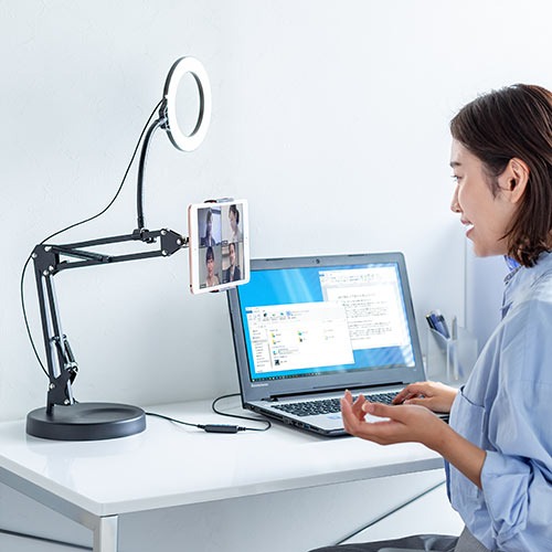 タブレットを固定しながら、顔を明るく照らせるリングライト付きスタンド。64灯のLEDを搭載し、調光・調色機能で好みの明るさや色味に設定できます。最大700ルーメンの明るさで、ウェブ会議や動画配信時に表情をクリアに映せるのが魅力です。