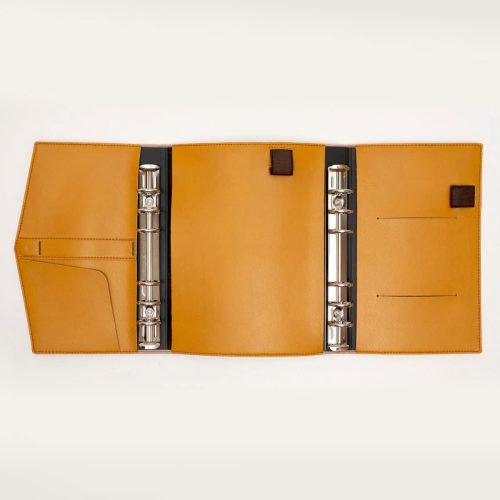 カラーは、ビジネスシーンでも使いやすいブラックとキャメルの2色をラインナップ。ミニマルで実用的なシステム手帳を求めるビジネスパーソンにおすすめです。