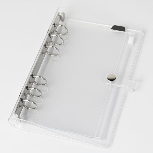 シンプルなクリアタイプのシステム手帳。領収書や細かいメモが入るチャック付きのクリアポケットや、文字を書くときに便利な下敷きが付いています。下敷きは上部に突起を備えた、インデックスにもなるデザインです。