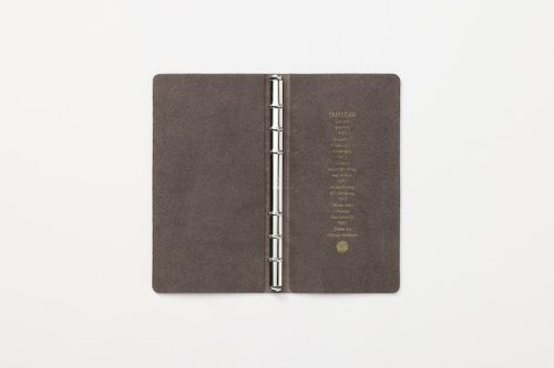 さらに、180°開く仕様のため、筆記がスムーズに行えるのも嬉しいポイント。コンパクトな13mm径リングで、約100枚のリフィルを収納できます。フラップ部分には大きなポケットを備え、メモ・領収書・シールなどを保管しておくのに便利。サッと出し入れできるペンホルダーも備えています。
