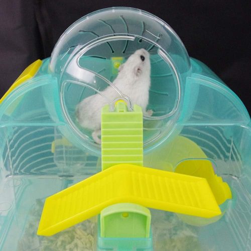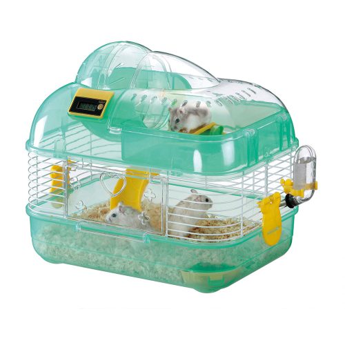 透明な広い空間が魅力のハムスターケージ。2階構造で上下にスペースを確保でき、ロボロフスキーハムスターやチャイニーズハムスターなど小動物にぴったりの設計です。全面クリアなパネルで、飼育中のハムスターの様子をいつでも観察できます。
