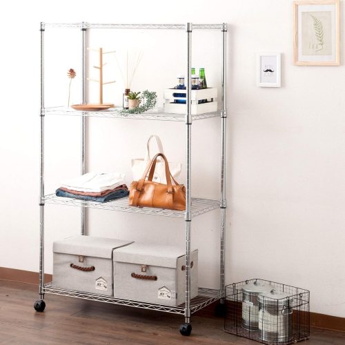 防錆加工を施したクロームメッキ仕様で、長期間使用してもサビにくいのが特徴。2.5cm単位で棚板の高さを調整できるため、収納物のサイズに合わせて自由にレイアウトが可能です。キャスターとアジャスターが付属しており、移動や固定は簡単に行えます。
