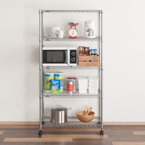 防錆加工を施したクロームメッキ仕様で、長期間使用しても錆びにくいのが特徴。2.5cm単位で棚板の高さを調整できるため、収納物のサイズに合わせて自由にレイアウトが可能です。キャスターとアジャスターが付属しており、移動や固定は簡単に行えます。