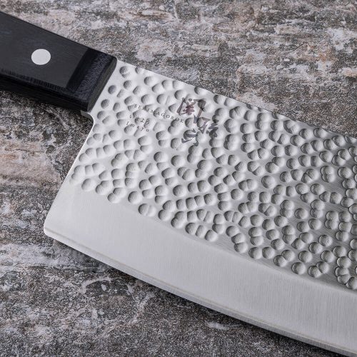 高級感のある槌目模様が美しい中華包丁。三工程刃付けを施しているため、鋭い切れ味が長持ちします。刃付け後のエッジを研磨加工でなめらかにすることで、食材への抵抗を減らし切込みのよさを実現しています。刃体の鋼材が柄の背側に通る背通し仕様で、丈夫さを追求しているのも魅力です。
