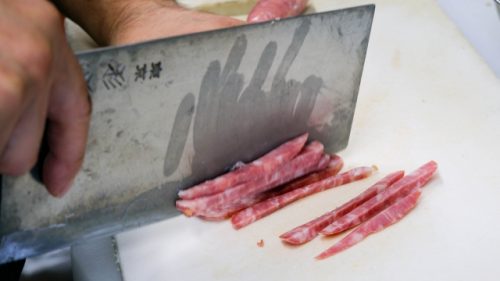 刃が厚く重みがある厚刃は、プロ仕様のタイプで切断力の高さが魅力です。骨付きのブロック肉を叩き切ったり、硬い魚の骨を砕いたりといった、硬い食材の調理で活躍します。また、冷凍品のカットにも使用できます。