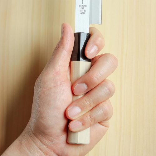柄が中空構造のため軽量で、扱いやすいのが魅力。使い勝手に優れた、おすすめの柳刃包丁です。