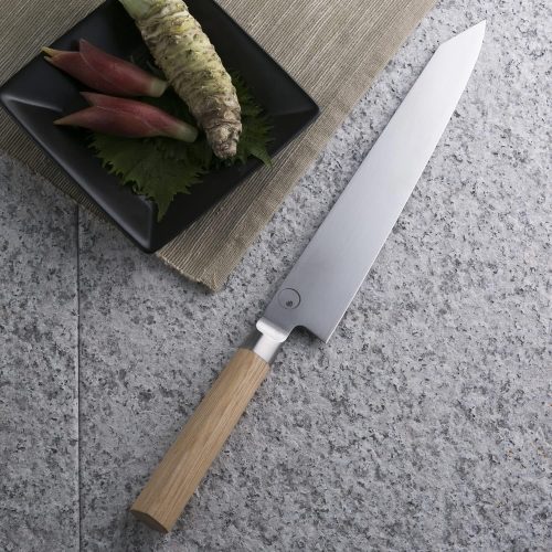 料理人とのコラボで生まれた刺身包丁。ミシュランの星を獲得した日本料理店「一凛」店主の橋本幹造氏との共同開発モデルで、プロの技術を家庭でも味わえるのが魅力です。刃渡り210mmの薄く長い刃体により、美しいお造りを楽しめます。