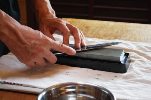 柳刃包丁を研ぐときは、はじめに砥石を水に10分から20分ほど浸して十分に吸水させます。研ぐ準備が整ったら、砥石に対して包丁の刃を30°から45°の角度に保ち、表側を中心に研ぎましょう。押すときに力を加え、引くときは力を抜くのが基本の研ぎ方です。