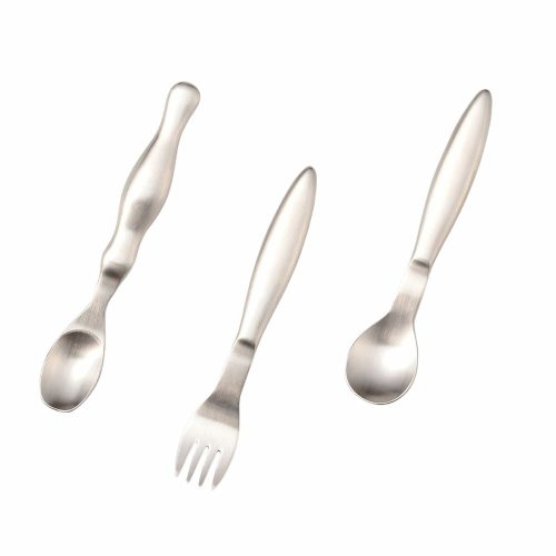 持ち手のゆるやかなカーブは人間工学に基づいて設計されており、すくって食べさせやすいのがポイント。食材のカットもスムーズです。高級スプーンにも使われるミラー仕上げが施され、デザイン性にも優れています。