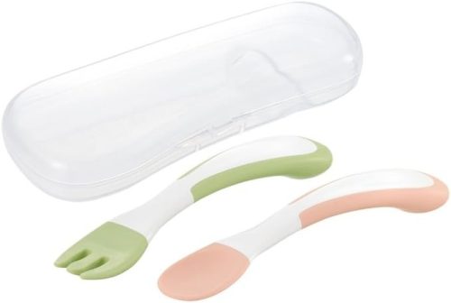 持ち運びに便利な保管ケース付き。スプーンの先端がテーブルに触れないように工夫されているため、外出先でも衛生的に使用できます。月齢に適した一口量がすくえる深さで、赤ちゃんのペースに合わせて食べる練習ができます。スプーン・フォークがセットになっており、メニューに合わせて使い分けられるのでおすすめです。