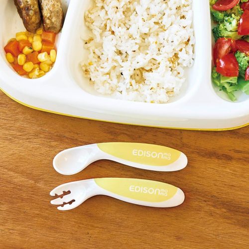 完了期以降におすすめの離乳食スプーンです。フォークもセットで付いており、さまざまな料理に対応可能。利き手関係なく使えるデザインを採用しています。