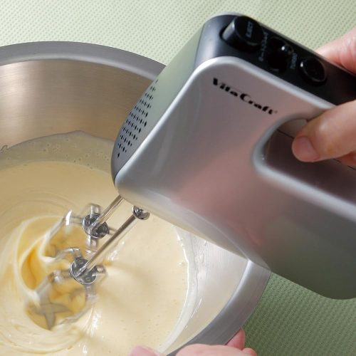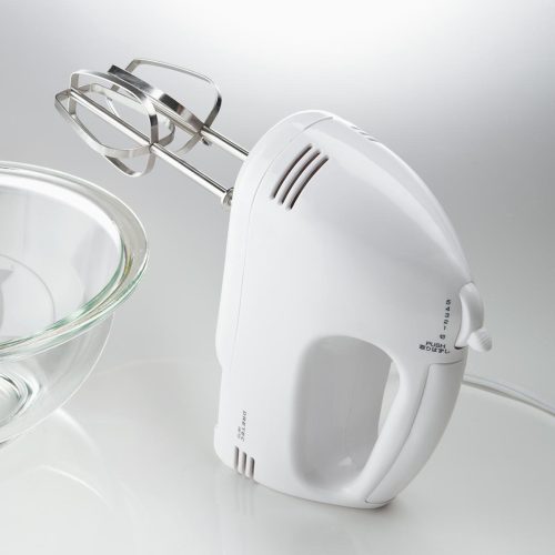 ふっくらしたケーキを作る際に役立つハンドミキサーです。スピードは5段階で設定可能。高速でボリュームを出してから低速でキメを整えることで、理想的なスポンジ生地が作れます。底面がフラットで、自立する仕様。調理途中でも手を離しやすく便利です。