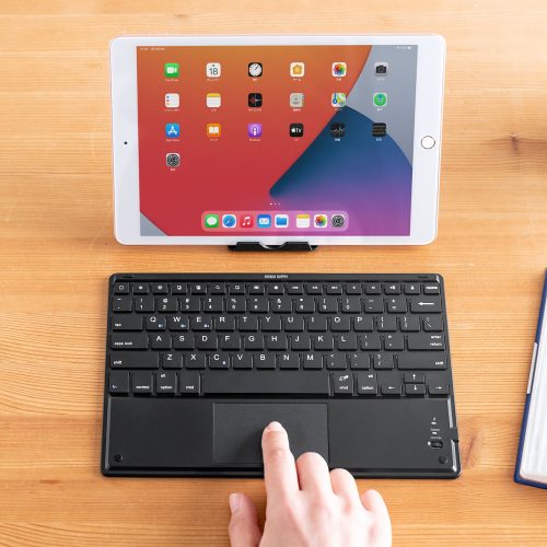 マウスのように操作可能なタッチパッドを搭載しているBluetoothキーボードです。マウスを必要としないため、わずかなスペースでも作業場所にできます。iPadを用いたテレワークなどにもおすすめです。
