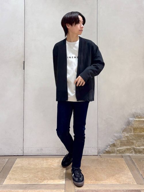 黒のノーカラーカーディガンを羽織った、シンプルなカジュアルコーデです。インナーには白地のロゴトップスを合わせ、モノトーンの配色でメリハリを強調。ボトムスは濃紺のスキニーパンツを選び、全体をすっきりと見せています。