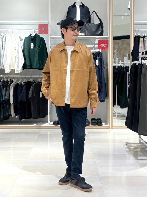 秋らしい季節感のある、大人のカジュアルコーデです。キャメルのスエードシャツにシンプルな白Tシャツを合わせて、顔周りを明るい印象に。ボトムスは細身のダークカラーのパンツをチョイスし、全身をすっきりとしたシルエットにまとめています。