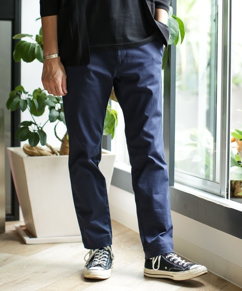 ベーシックなテーパードに美脚見えするようスキニーシルエットをプラスしたスキニーパンツ。程よくゆとりがありつつもすっきりとしたラインで、きれいめに穿きこなせるアイテムです。
