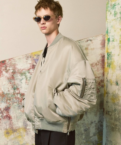 現代的なオーバーシルエットが目を引くMA-1ジャケット。光沢のあるナイロン素材を使い、MA-1のディテールを踏襲しつつも上品に仕上げています。中綿入りで保温性が高く、軽量で快適な着心地も魅力です。