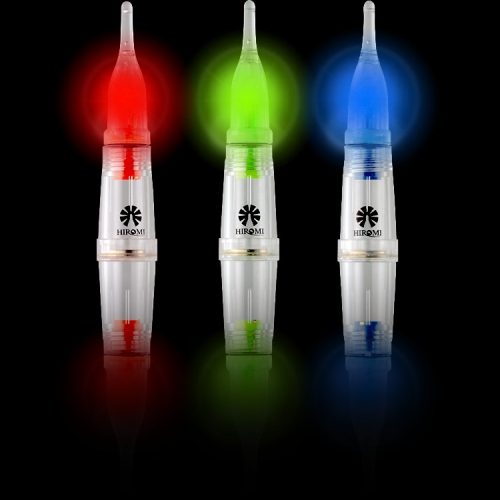1パッケージあたりのアイテム数は5つ。カラーは青・白・緑・赤の4つに、3色変化する1つがセットになっています。タイプとしては使い切り製品で、点灯寿命の目安は150時間。サイズは5×1.8cm、重さは約10gで、仕掛けに取り付けるのはもちろん、単体に直接ハリのみを付けることも可能です。