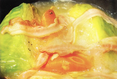 ダッチオーブンで作る、ボリュームのある煮込みレシピを紹介します。材料はキャベツ1個・ベーコン10枚・にんじん1本・たまねぎ1個です。