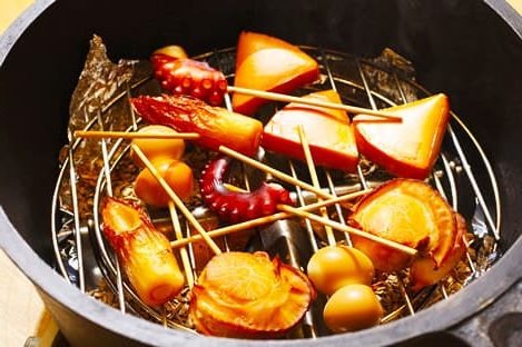 アウトドアで活躍する、おつまみのレシピです。ダッチオーブンにアルミホイルを敷いたら、ウッドチップを入れ、網をのせて強火にかけましょう。チップから煙が出たら網の上に、塩コショウを振ったタコ足・うずらの卵・チーズなど食材をのせます。