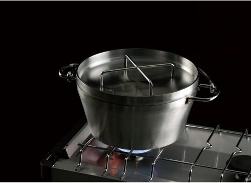 リッドリフターやボトムプレート、持ち運びに便利な収納ケースが付属。大人数でアウトドアクッキングを楽しみたい方におすすめのモデルです。