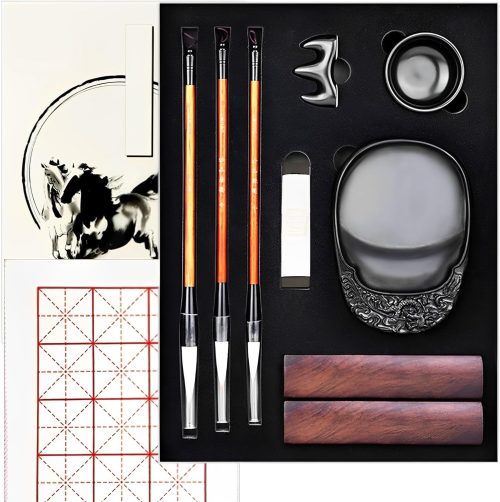 硯は、軽量性に優れたABS樹脂を使用。気軽に持ち出すことが可能です。そのほかのセット内容は、太筆・細筆・カラー文鎮・カラー筆巻き・水差し・下敷き・半紙ファイルと、充実したラインナップで構成されています。ただし、墨や墨液が付属していない点には注意してください。