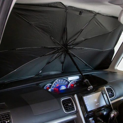 傘式の車用サンシェードは、折りたたみ傘のような構造をしたワンタッチで展開できるタイプです。傾斜が急なフロントガラスにもフィットしやすく、手軽に設置できます。折りたたむとコンパクトにまとまり、車内に置いておきやすいのが魅力です。