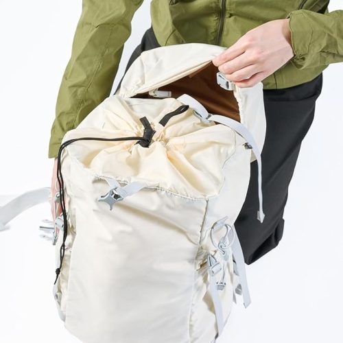 雨蓋を被せるトップローディング型の見た目が特徴の登山用リュックです。荷室に雨が侵入するのを防げるほか、脱いだ衣類を挟んで持ち運べます。