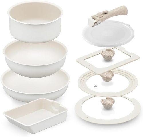 取っ手が着脱できる設計で、重ねてコンパクトに収納できるのが魅力。ガス火・IH・オーブン調理に対応しており、さまざまな料理に活用できます。基本的な調理に必要なアイテムが手頃な価格で揃うため、新生活を始める方におすすめです。