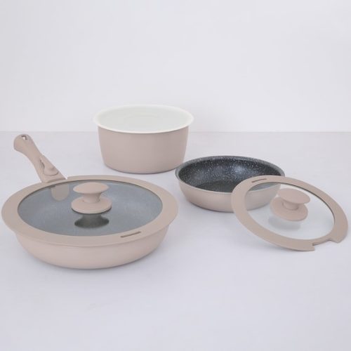 毎日の料理を快適にするオール熱源対応の調理器具セット。フライパン20cm・26cm、マルチポット18cm、ガラス蓋18cm、専用取っ手の5点で構成されています。内面はマーブルコート加工のため焦げ付きにくく、金属ヘラも使用可能です。