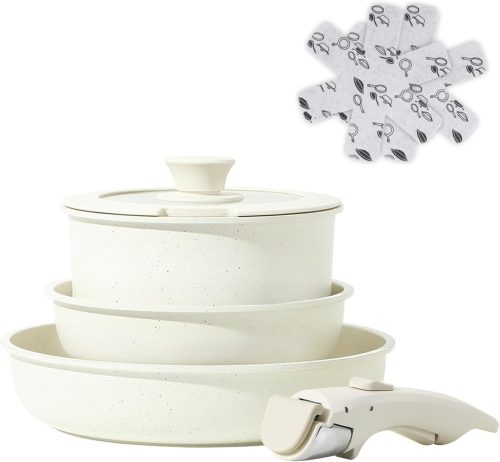 20cmと26cmのフライパン、ポット、ガラス蓋がセットになっており、着脱ハンドルで省スペース収納が可能。PFOA・PFOSフリーの安全設計でIH・ガス火に対応しています。一人暮らしや限られたキッチンスペースを有効活用したい方におすすめです。