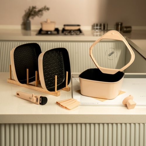 便利機能が充実したオールインワンクックウェアセット。特許取得のN-ナノキューブ触媒コーティングを採用し、PFOAフリーで安心して調理できるのが特徴です。22cm鍋・フライパン・グリルパンに加え、スタンディング蓋とマルチセーフハンドルがセットになっています。