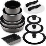 22cmと26cmの深型フライパン、18cmの鍋、専用フタ、取っ手の5点セット。オーブンでも使用できるため、幅広い調理方法に対応できます。忙しい方やキッチンスペースを効率的に使いたい方におすすめです。