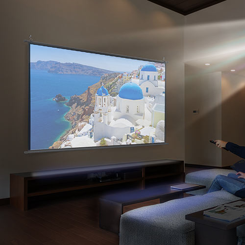 窓のロールスクリーンに近い感覚で扱えるモデルも多く、はじめて導入する方にも選びやすいタイプです。天井や壁の上部に取り付ければ、毎回のセッティングの手間を抑えやすいのも魅力。日常的にホームシアターを楽しみたい方に向いています。