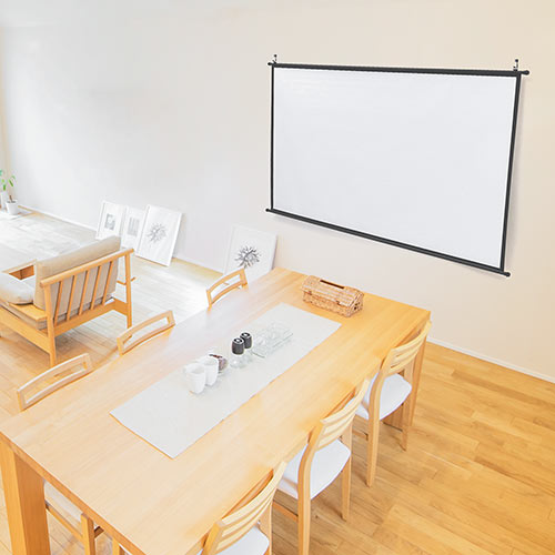 スクリーンを高い位置に設置できるため、床のスペースを取りにくいのもメリットです。ロールスクリーン式より構造がシンプルな製品もありますが、使用のたびに巻き取りや取り外しが必要なモデルもあるため、使い方に合わせて選ぶのがポイントです。