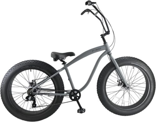 26×3.0インチの極太タイヤを搭載したビーチクルーザーです。幅3インチのタイヤが存在感を際立たせます。スチールフレームにシマノ6段変速を搭載し、耐久性と快適なギアチェンジを実現。前後にVブレーキを搭載し、ブレーキをかけやすい設計です。